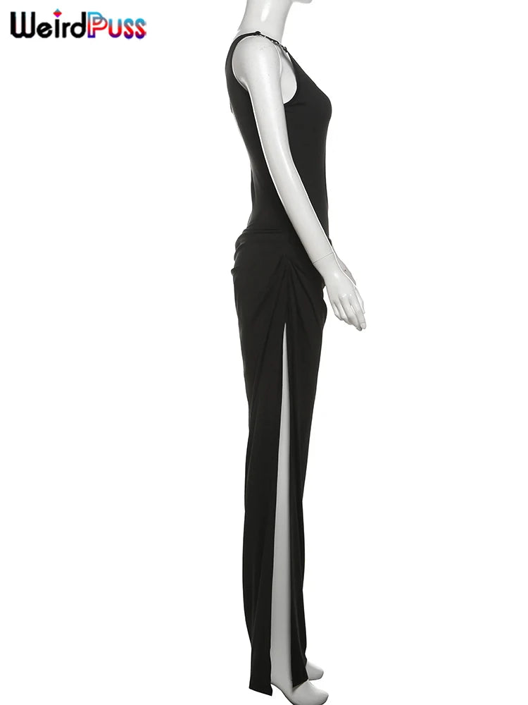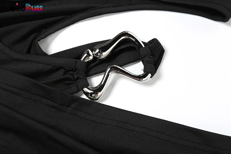 Metal Buckle Dress Hollow Split One Shoulder Skinny Ruched Waistless Midnight Clubwear Maxi Bodycon